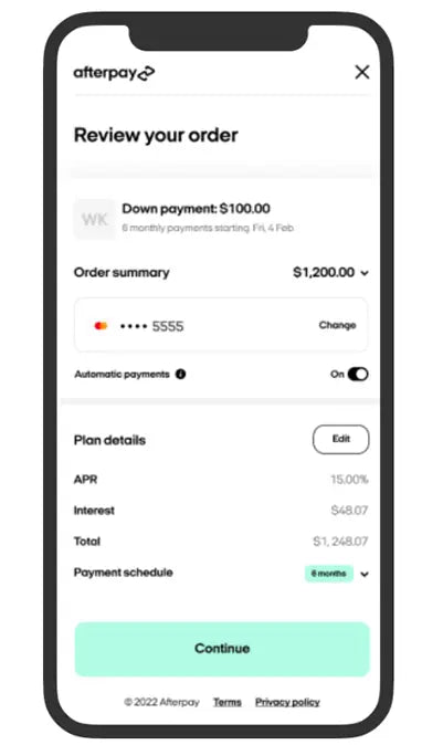 We pay the retailer in full and upfront on your behalf. You pay for the first instalment of 25% at the time of purchase, and the remaining three instalments will be automatically deducted from your nominated debit or credit card over the following six weeks.